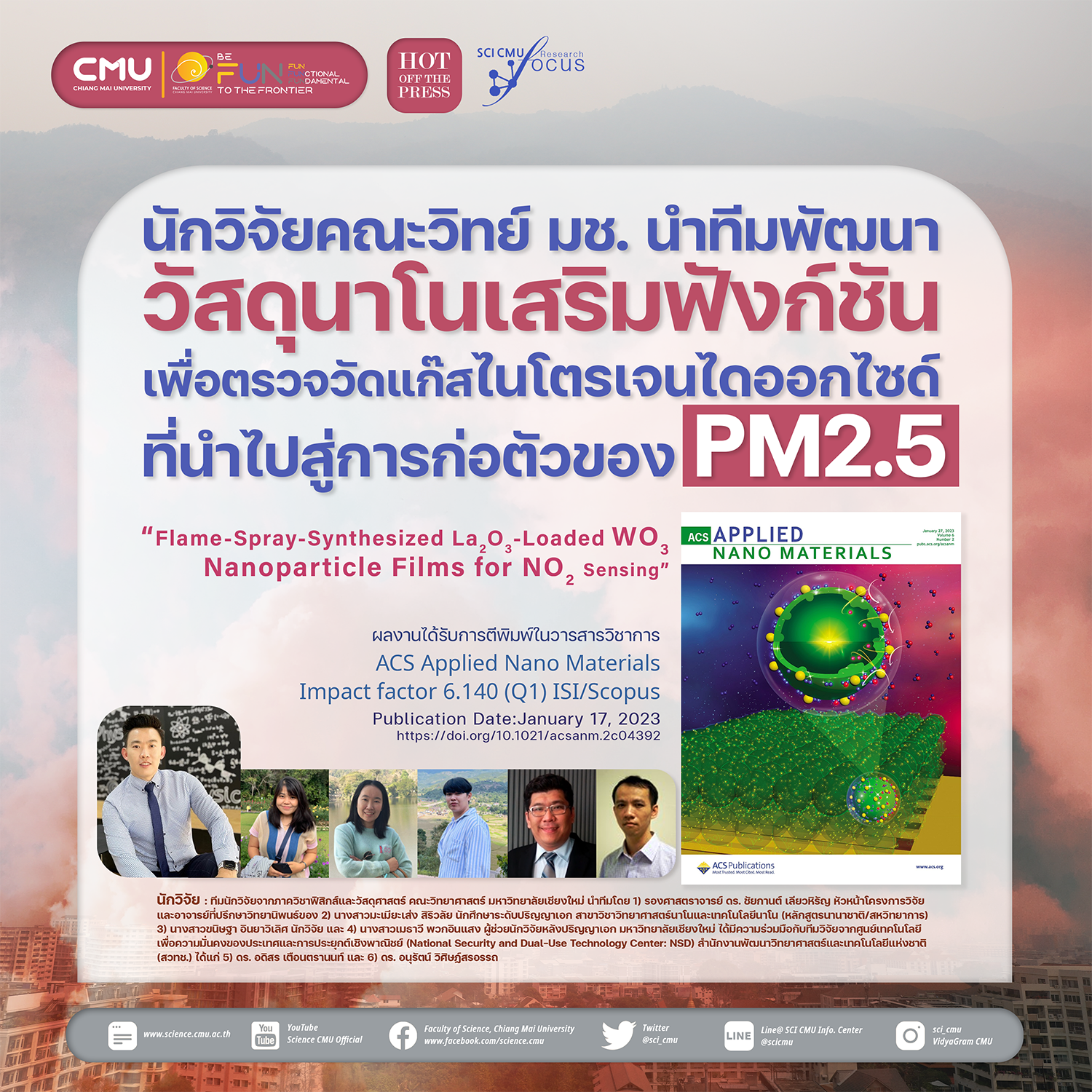 นักวิจัยคณะวิทย์ มช. นำทีมพัฒนาวัสดุนาโนเสริมฟังก์ชัน เพื่อใช้ตรวจวัดแก๊สไนโตรเจนไดออกไซด์ ที่นำไปสู่การก่อตัวของมลภาวะ PM2.5 ในสิ่งแวดล้อม