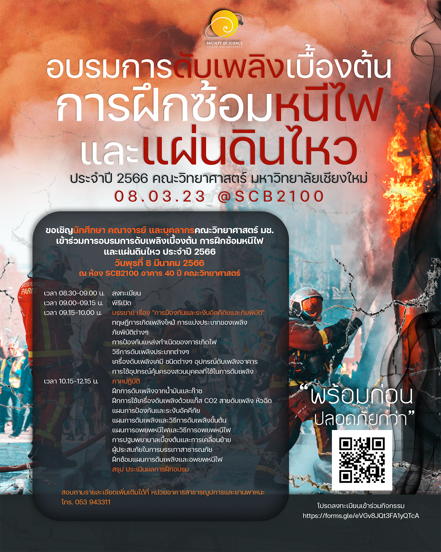 8 มีนาคมนี้ ขอเชิญนักศึกษา คณาจารย์ และบุคลากรคณะวิทยาศาสตร์ เข้าร่วมการอบรมการดับเพลิงเบื้องต้น การฝึกซ้อมหนีไฟ และแผ่นดินไหว ประจำปี 2566